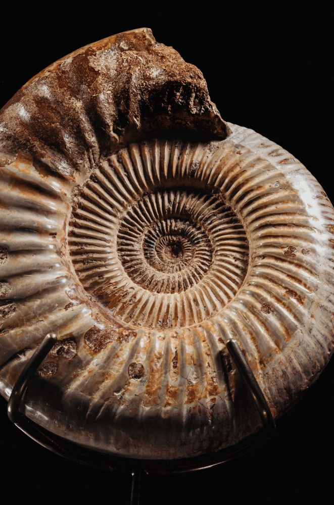 Аммониты рода Perisphinctes были обитателями прибрежных вод во времена юрского периода. Их раковины обладают практически правильной круглой формой и значительными размерами. Другая характерная черта – многочисленные поперечные ребра, увеличивающие прочность раковины. Особенностью данного экземпляра является пропитанный кальцитом перламутровый слой, превратившийся в гладкую минеральную поверхность, напоминающую глазурь на керамике.