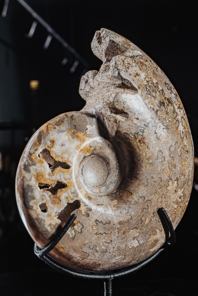 Сейчас внутренняя поверхность отсеков покрыта корочками из кристаллического кальцита. Сочетание внутренних полостей, извилистых отверстий и узоров придает аммониту совершенно фантастический вид.