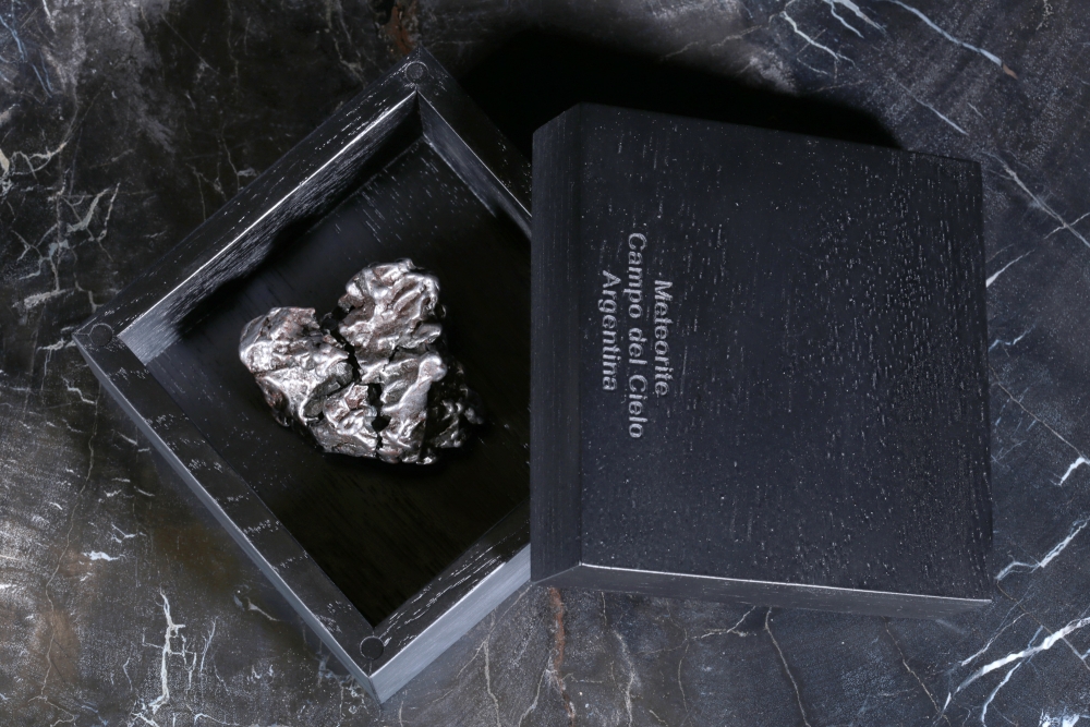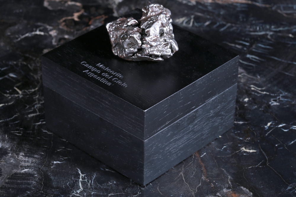 К метеориту прилагается шкатулка из дерева черного цвета. На крышке шкатулки вырезано название метеорита. Шкатулку можно использовать как для хранения, так и в качестве подставки для демонстрации образца.