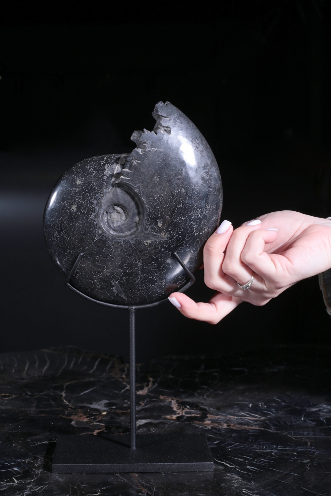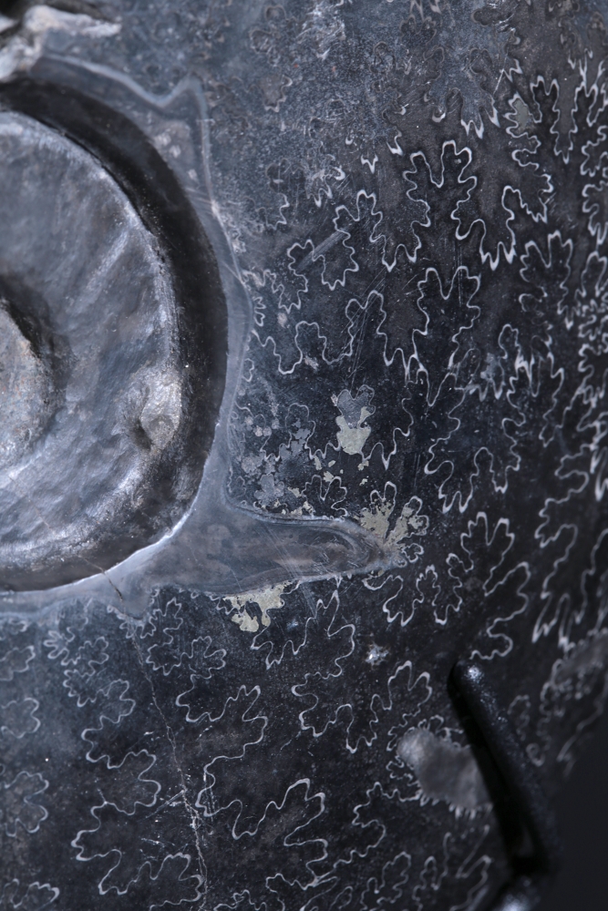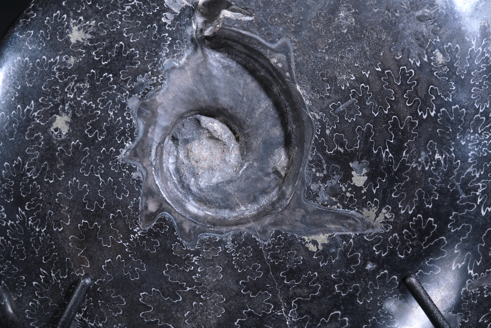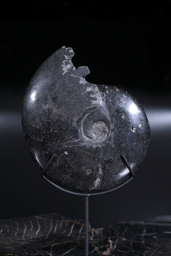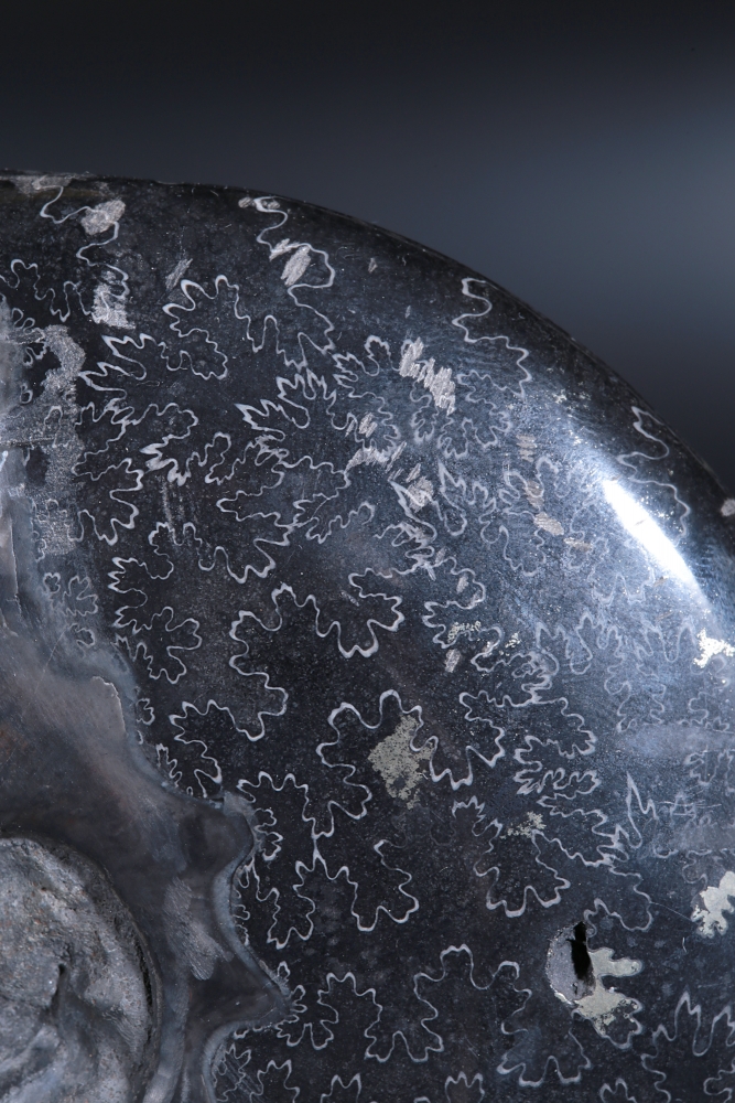 Узор на поверхности раковины образован лопастными линиями. В этих местах внутренние перегородки соединялись с внешними стенками раковины аммонита. Раковина по большей части замещена кальцитом, имеющим теплую, приятную окраску.