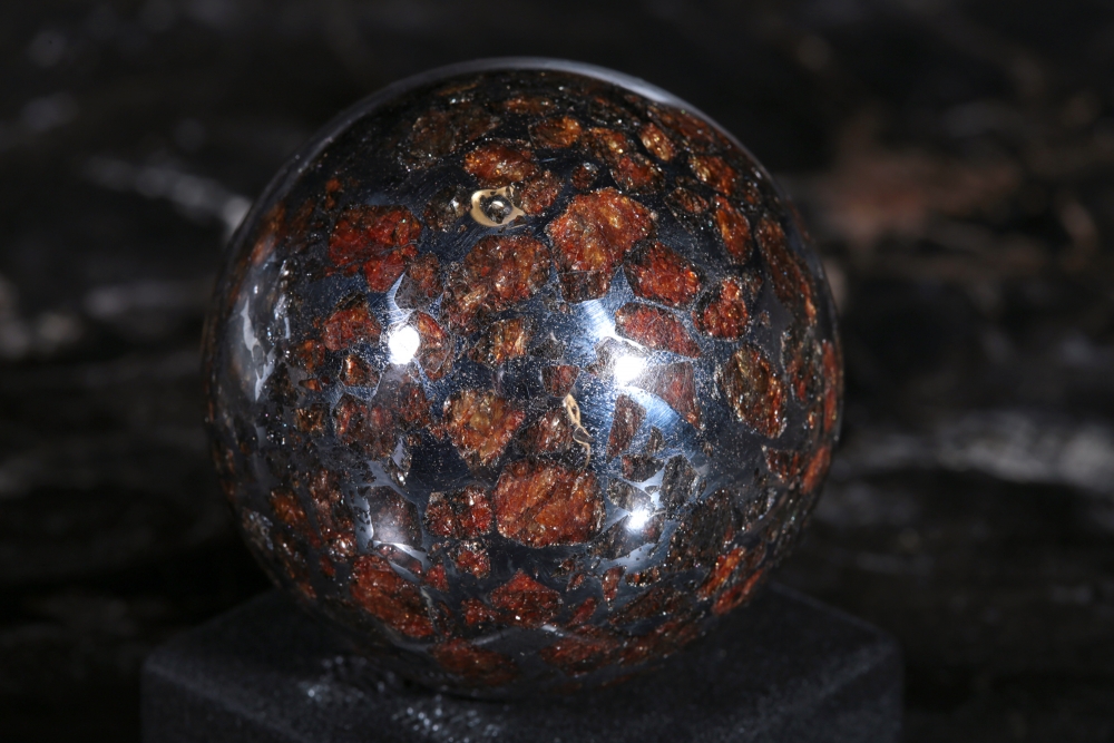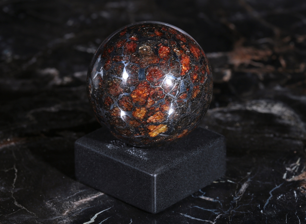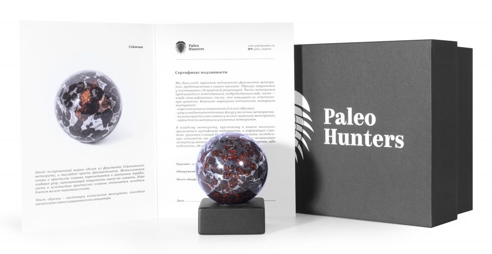 Этот полированный шарик сделан из фрагмента Сеймчанского метеорита, и выглядит просто фантастически. Металлическая основа и кристаллы оливина переплетаются в хаотичном порядке, создавая узор, напоминающий поверхность какой-то планеты. Игра света в золотистых кристаллах оливина оттеняется холодным блеском железо-никелевого сплава.
